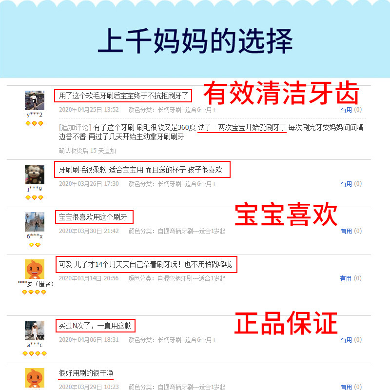 Long-handled toothbrush -- Suitable for 6 months Self-grip curved handle toothbrush-- - Suitable for 1 year old Long-handled toothbrush Original flavor(toothpaste for 6 months )Long-handled toothbrush Apple flavor(toothpaste for 18 months) Long-handled toothbrush Apple flavor (toothpaste for 18 months) Long-handled toothbrush Apple flavor (toothpaste for 18 months) Long-handled toothbrush Apple flavor (toothpaste for 18 months