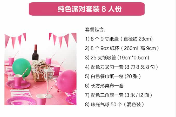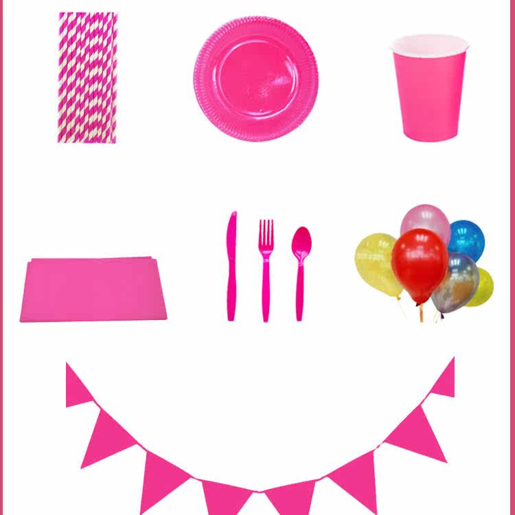 Pink table cloth 1 sheet of pink triangular flag 1 set of pink cupcakes 8 Pink Striped Straws 25 Roots Pink dinner plate 8 Pink Theme Suit 8 Man Pink Pink Knife Fork Spoon 8 People