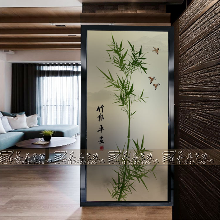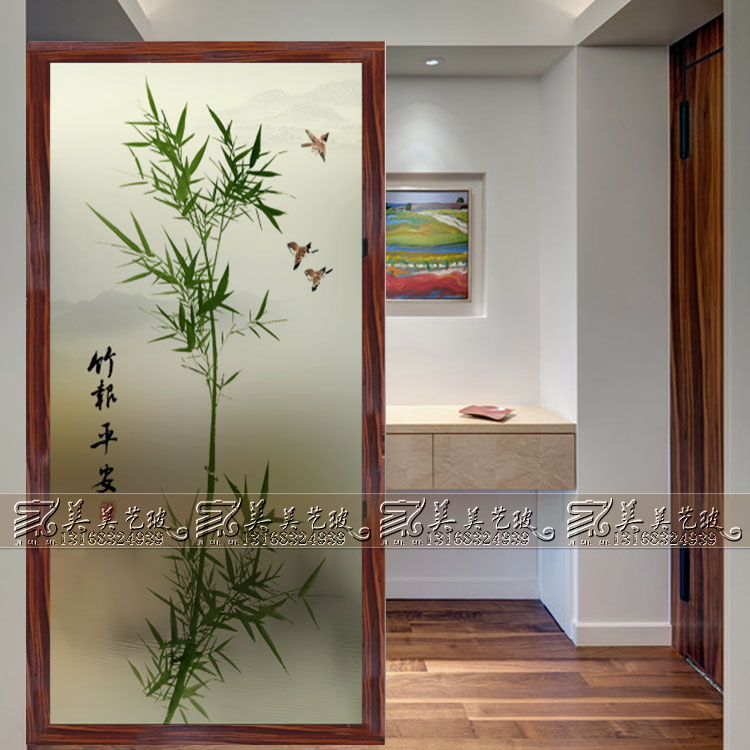 Chinese art glass partition screen decoration frosted craft porch background wall sliding door glass simple bamboo bird