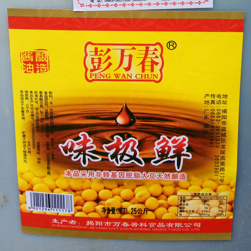 Jieyang City Peng Wanchun taste very fresh bulk 50 pounds of large barrels of soy sauce sausage powder braised goose and duck meat catering restaurant dedicated