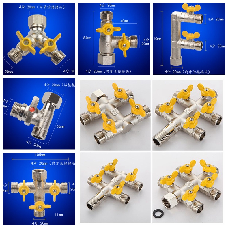 Water splitting valve with live contact three-way angle valve for four out of 4 tooth outer tooth four-way tap splitter connector