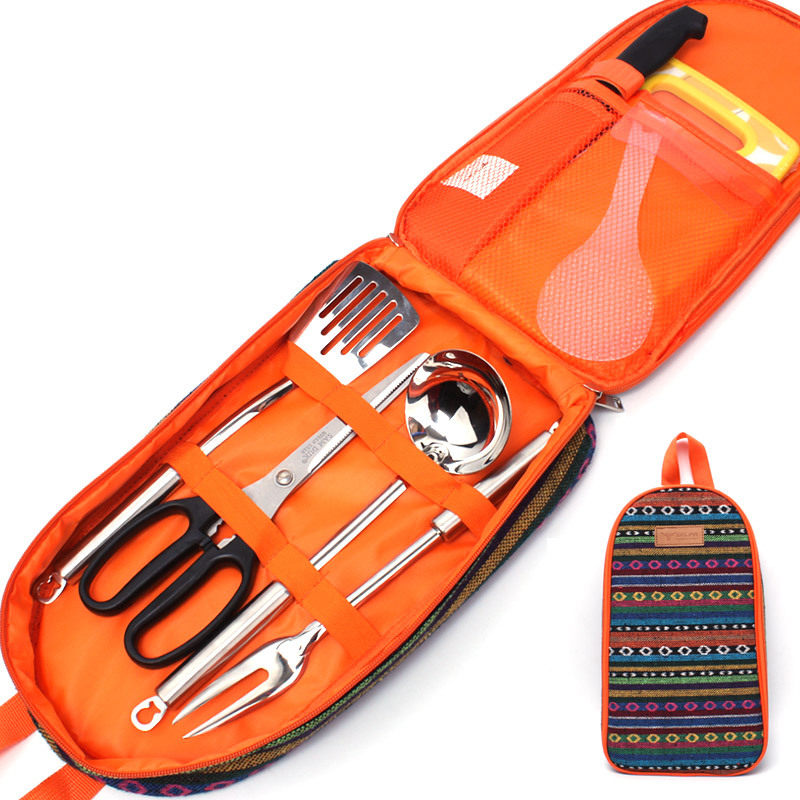 Korean Outdoor cookware Set Picnic kitchenware Portable cutting board shovel Stainless steel 7-piece set handbag picnic bag