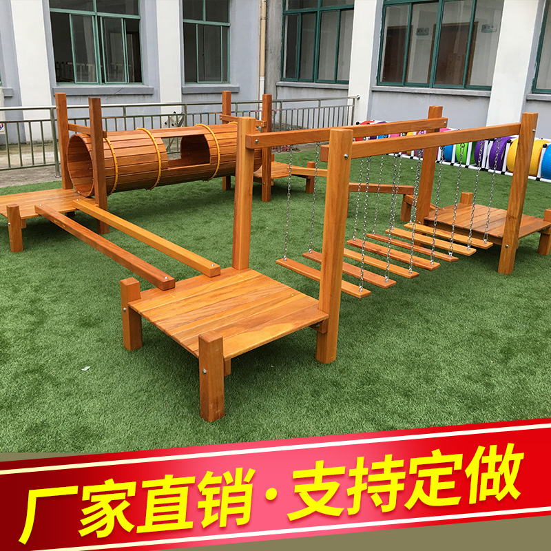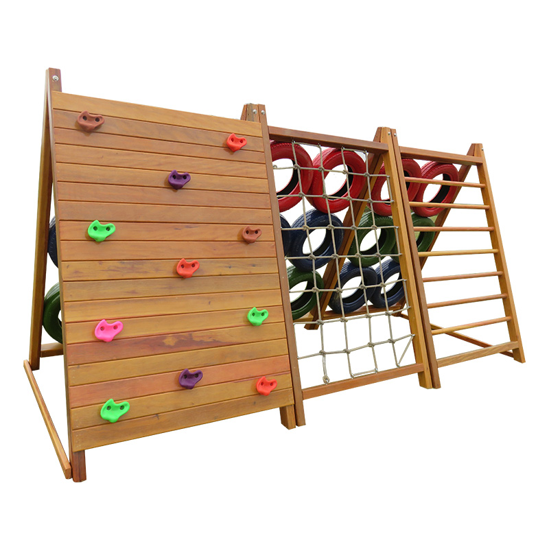 Wooden seesaw thrilling bridge four-in-one trapezoidal climbing frame on the knife Mountain combination climbing belt swing wooden climbing 3 tires wooden climbing 6 tires drilling slide combination physical fitness training 1