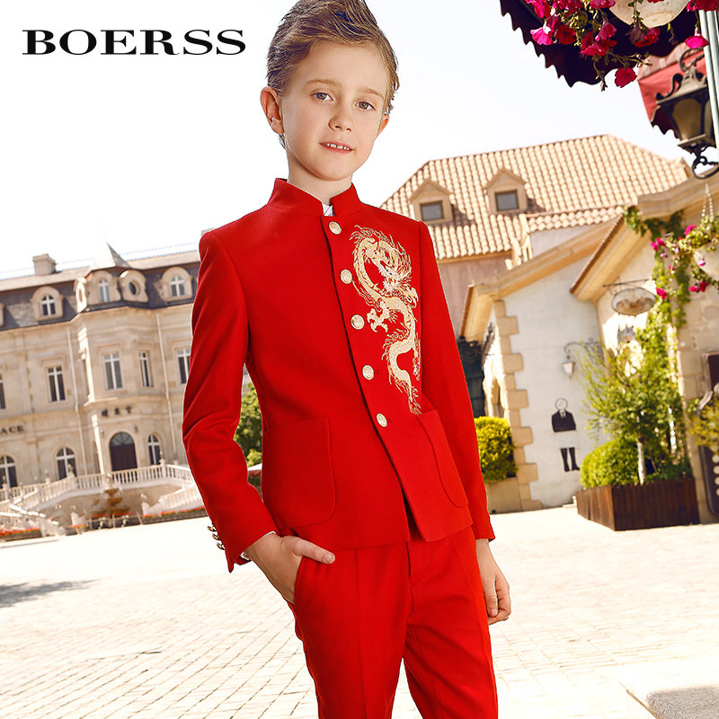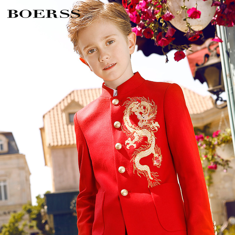 BOERSS Boys dress suit Light luxury embroidered dragon Chinese stand collar children's suit suit Chinese style big red autumn