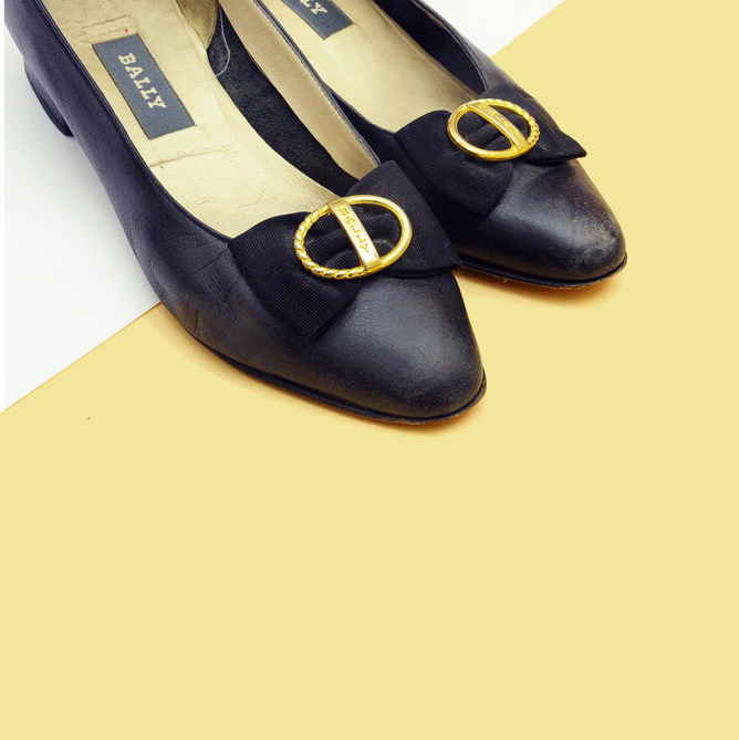 B A L L Y black bow gold retro girl woven Saint Luo blue Hepburn elegant boat shoes 80S design sense heel lace doll shoes black woven trim simple pointed black round toe suede