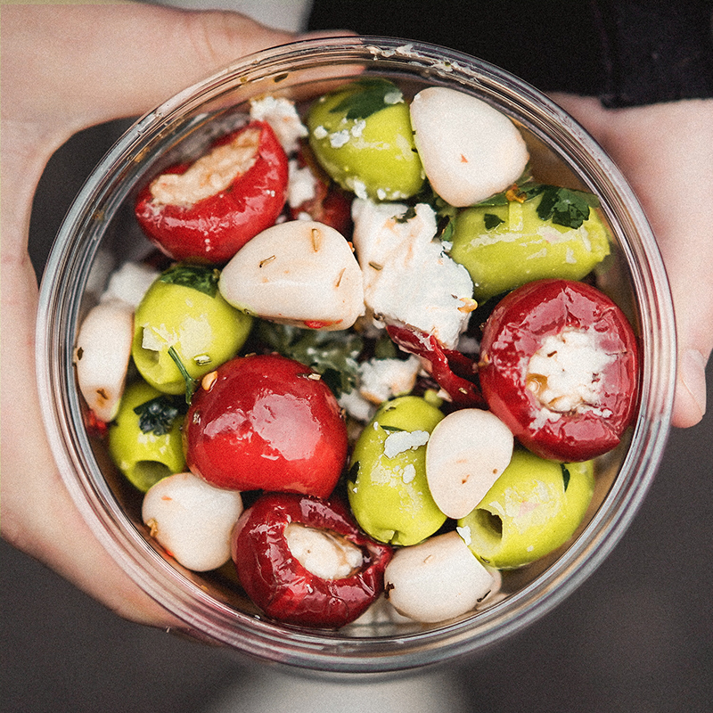 Green olives Water Salt Acidity regulator (lactic acid, citric acid) Antioxidant (ascorbic acid), etc.