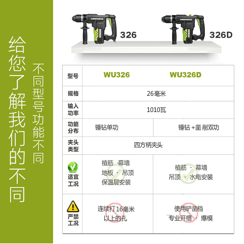 WU326 Single Use Electric Hammer Standard Set WU326 Single Use Electric Hammer Deluxe Set WU326D Dual Use Electric Drill Standard Set WU326D Dual Use Electric Drill Deluxe Set WU32
