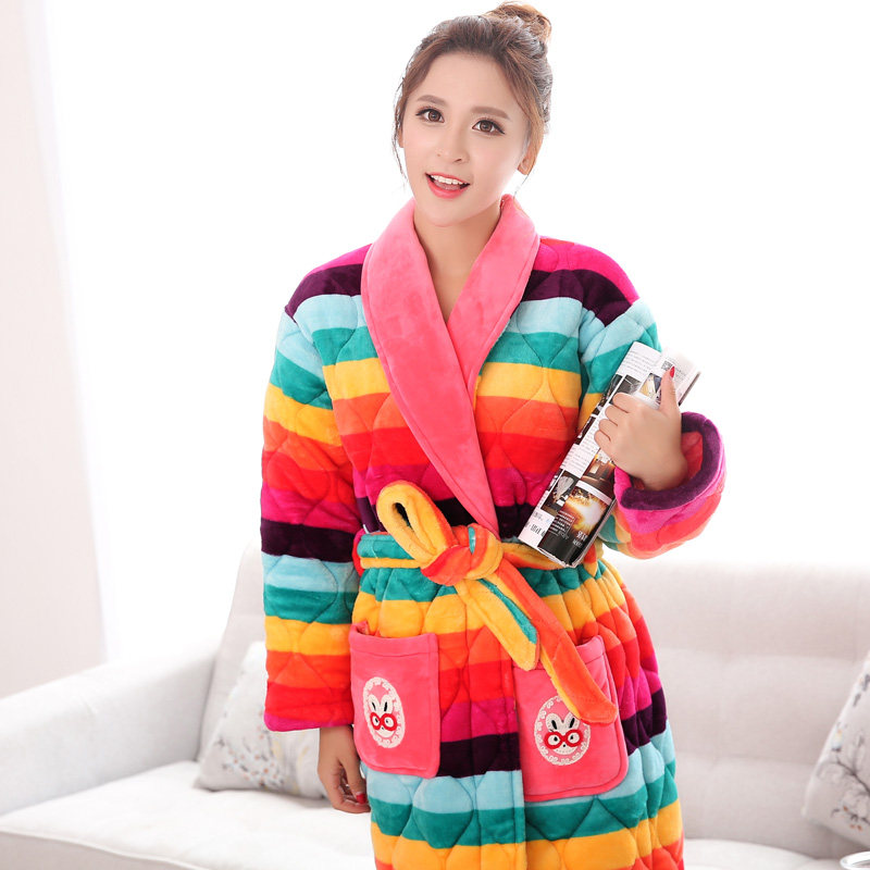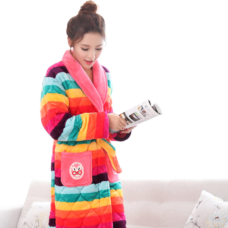 Sweet nightgown women's winter long version cute coral fleece pajamas three-layer quilted jacket plus velvet thickened home clothes bathrobe winter