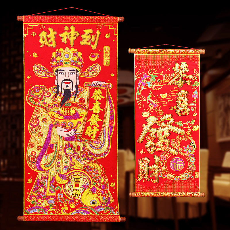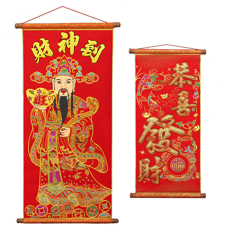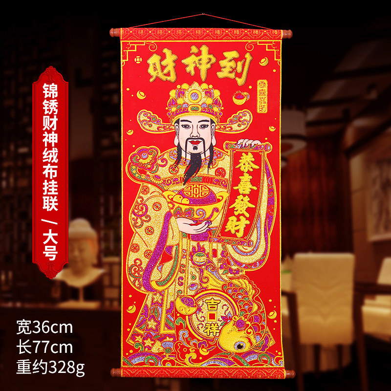 The god of wealth to the middle hall painting living room scroll hanging painting rural hall house wall hanging New Year housewarming hanging flannel gilded pendant