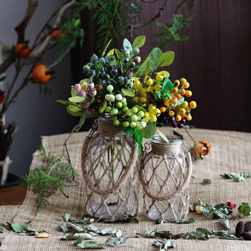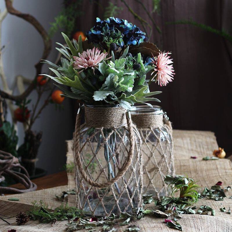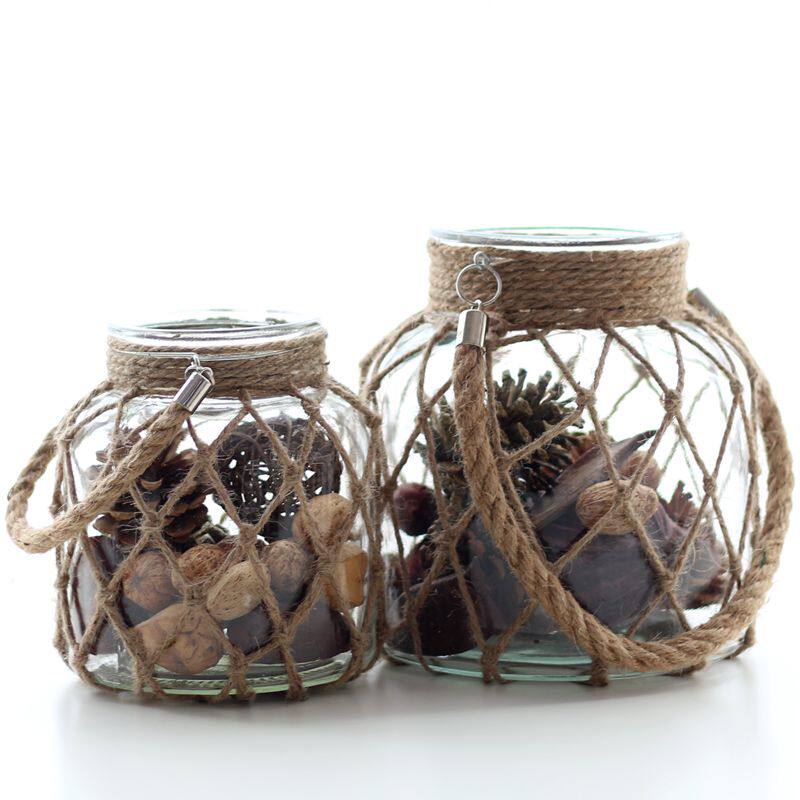 (Mountain Trees) American Countryside Handmade Woven Hemp Rope Mesh Glass Vases Decorative Bottle Inserts Vases Autumn Winter