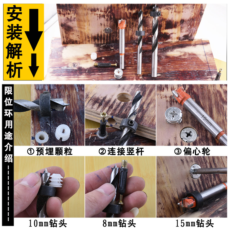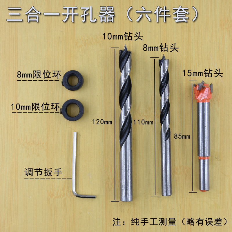 Three-piece set of drill bits (without limit ring) Six-piece set of drill bits (including limit ring) 8mm (edge cleaning drill bit) 10mm(edge cleaning drill bit) 15mm (woodworking drill bit) limit ring (8-piece set)