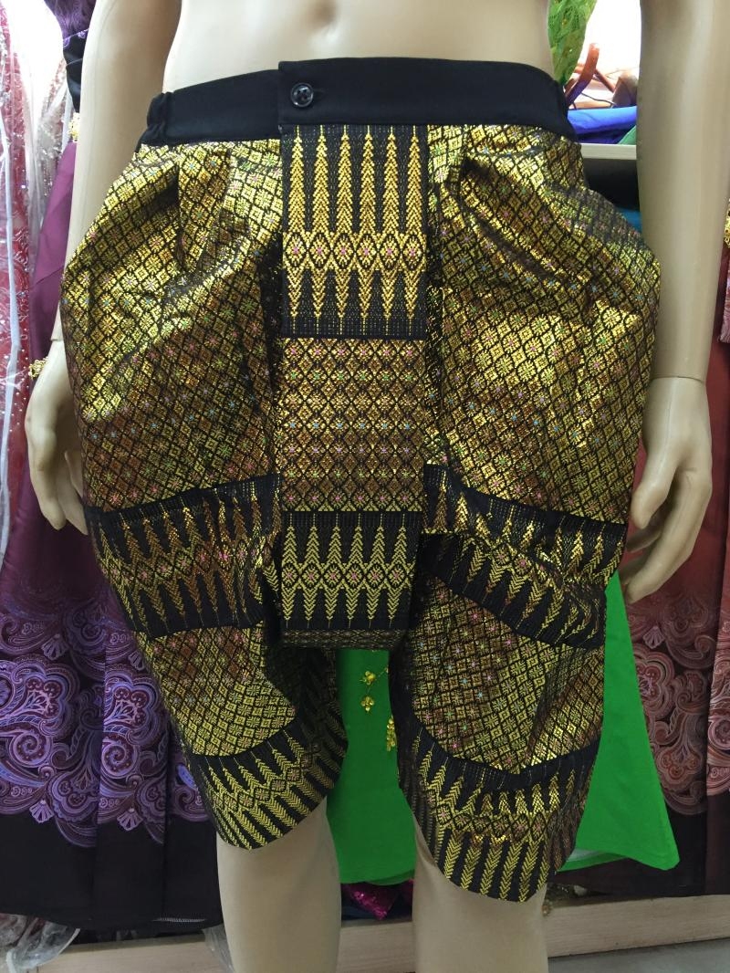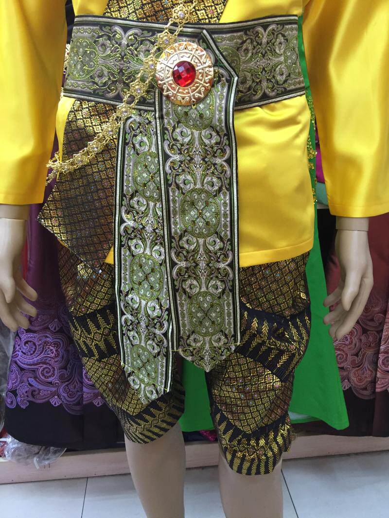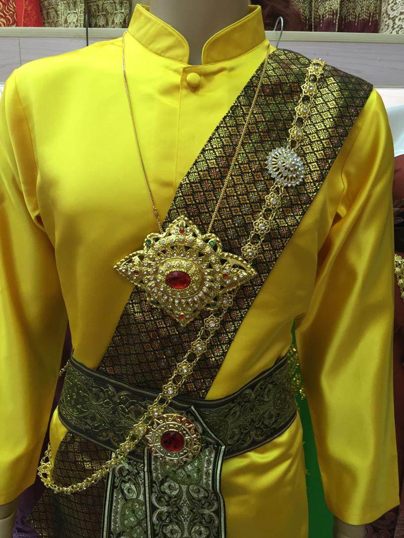 Thai traditional costume male golden yellow standing collar long sleeves photo studio photo writing Allah holding the annual meeting micro-film costume
