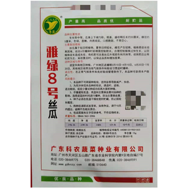 Cantonese-vegetables Yalu 8 Number of silk melon (15 gr) The Guangdong Provincial Academy of Agricultural Sciences in Guangdong Province has the seed of silk melon in spring and autumn