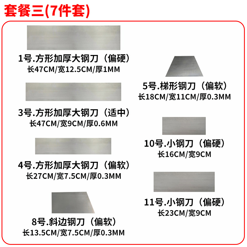 1#加厚长方形钢刀片一片2#梯形大钢刀片一片3#长方形钢刀片一片4#中好长方形钢刀片一片套餐一套餐三套餐五套餐六套餐八