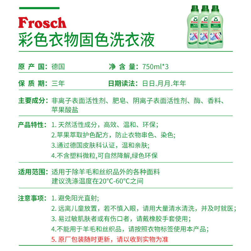 Frosch Germany Import Natural Color Clothing Anti-Coloration Strings Color Solid protection Lasting Aroma Laundry Detergent * 3 bottles