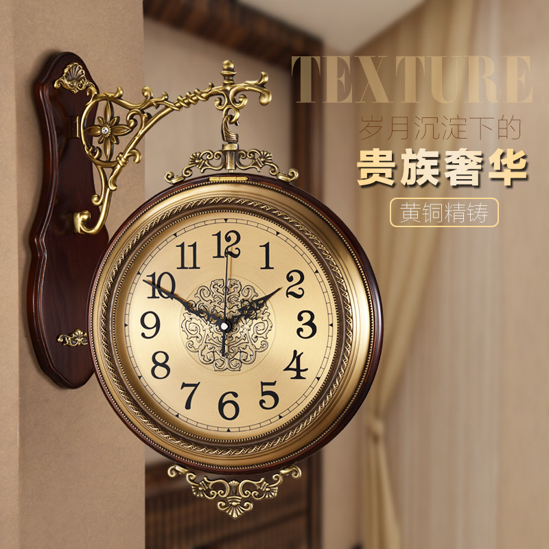 Brass European-style wall clock double-sided clock living room fashion clock creative solid wood decorative art wall hanging mute wall watch