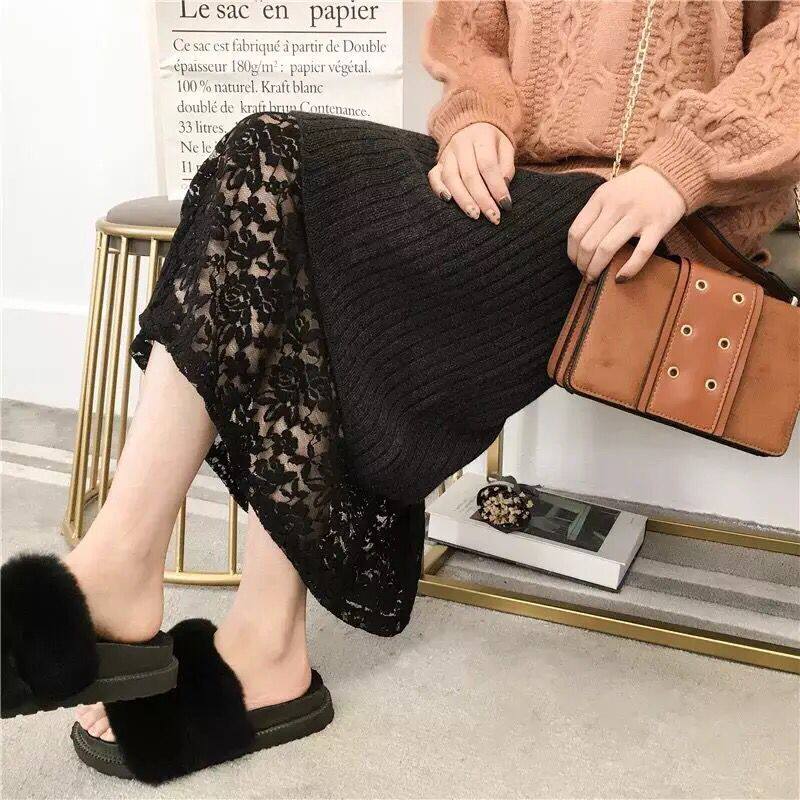 Pregnancy Woman Dress Spring Autumn New Bag Hip Knit Half Body Dress Lace Splicing Mid long version Long dress Belly One Step Wool dress