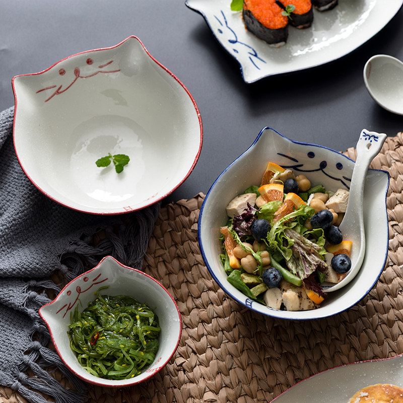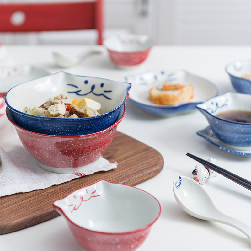 A Blue Dip Sauce Bowl (two clothes) B red dipping sauce bowl (two clothes) C blue small rice bowl D red small rice bowl E blue face bowl F red noodle bowl G blue soup bowl H red soup bowl i blue spoon (two