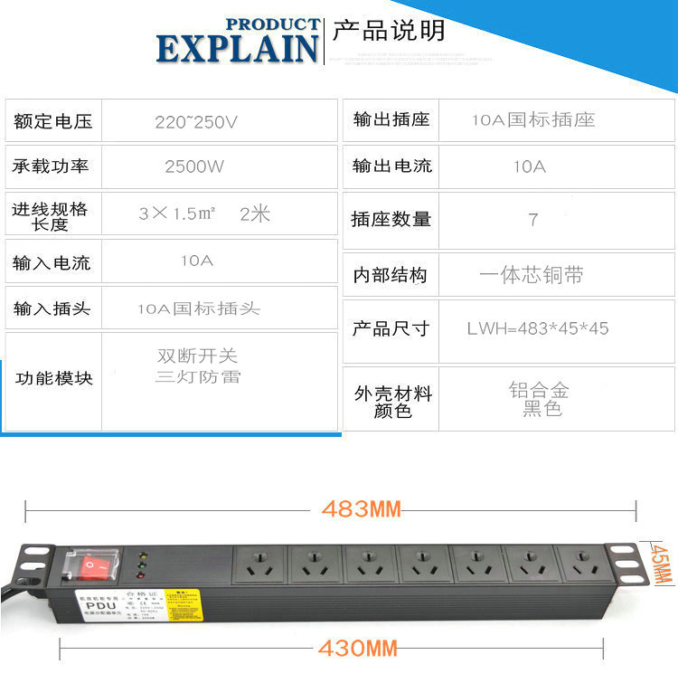 PDU cabinet special power wiring socket aluminum alloy shell 19 inches 10A national standard lightning protection and surge protection