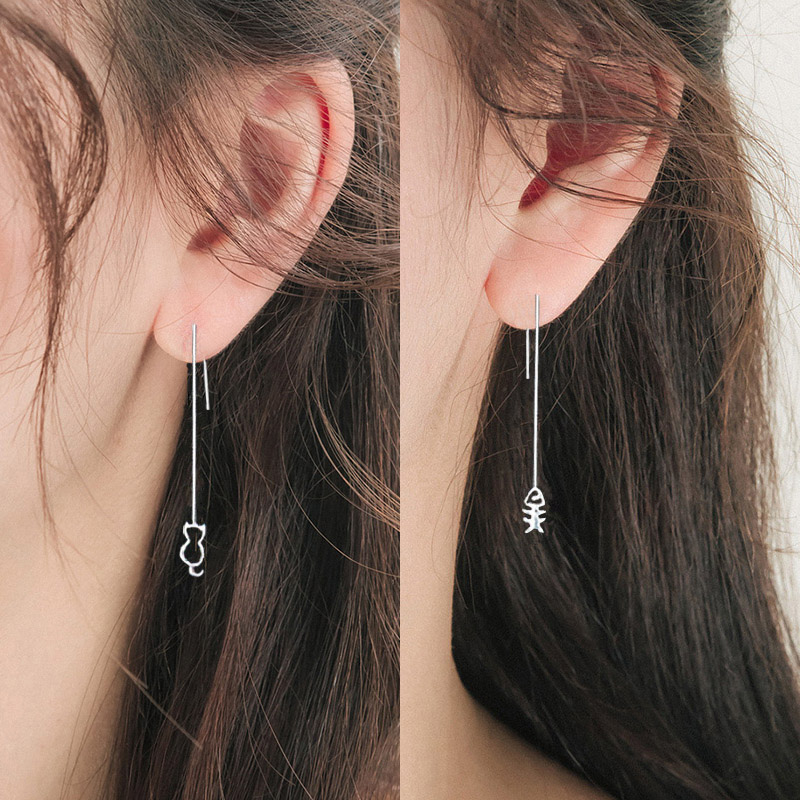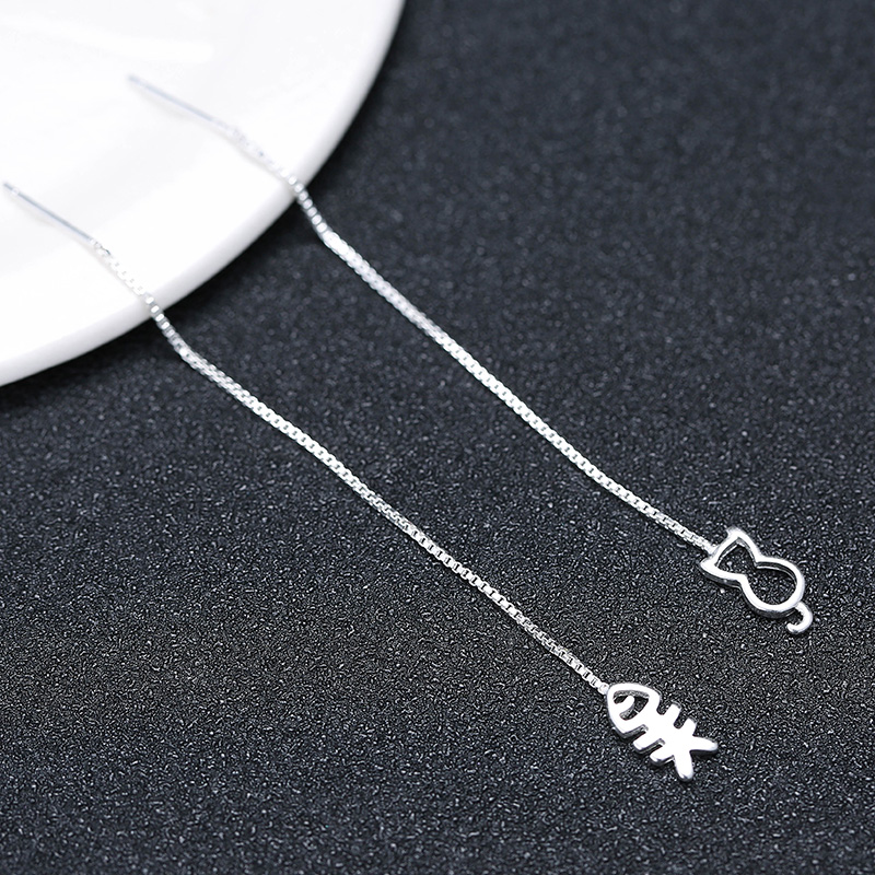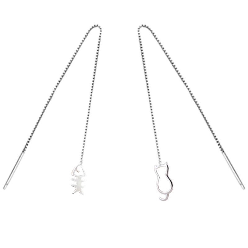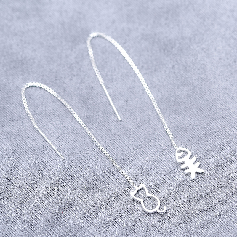 Japan Korea Creative S925 silver cat and small fish ear line asymmetrically long earrings are simple cute student ear crashes