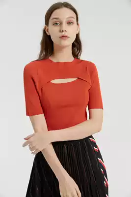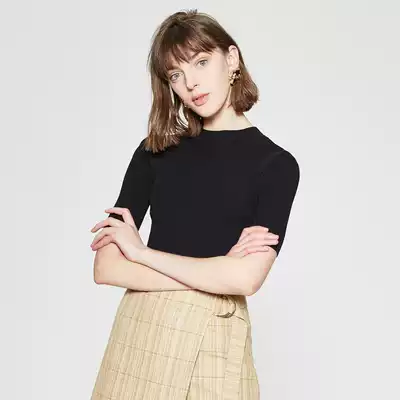 MECITY women's solid color fashion simple temperament slim half high collar design short sleeve knitted T-shirt