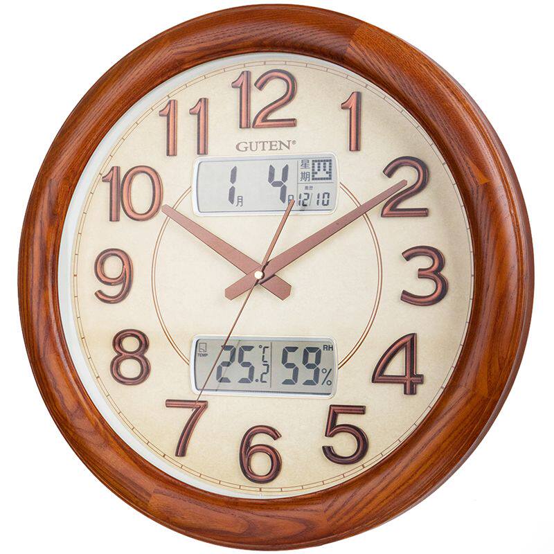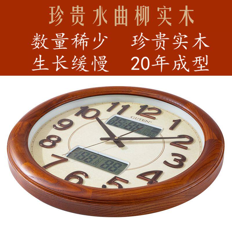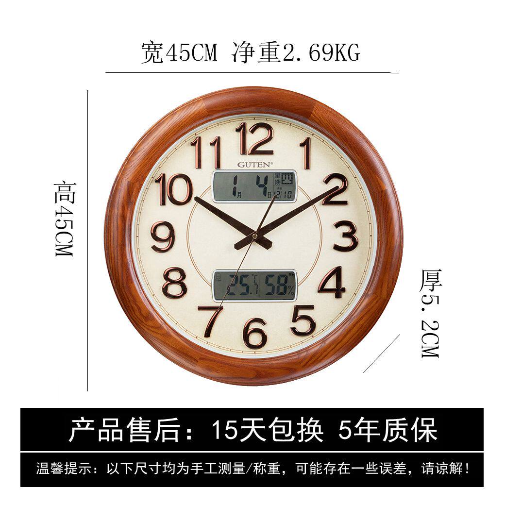 Jinzhongbao solid wood LCD living room wall clock Chinese European-style temperature and humidity meter calendar large wall watch mute quartz clock