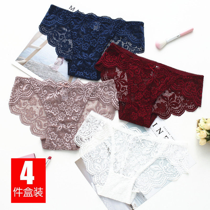 4 pieces of underwear women's pure cotton crotch lace sexy hollow transparent low waist no trace hot temptation large size briefs