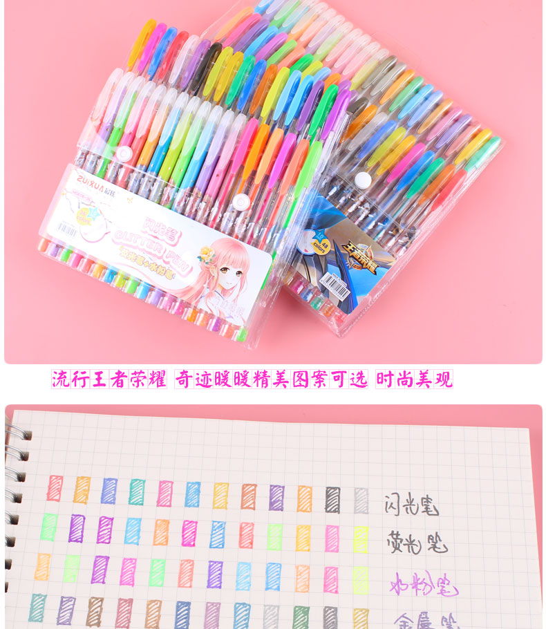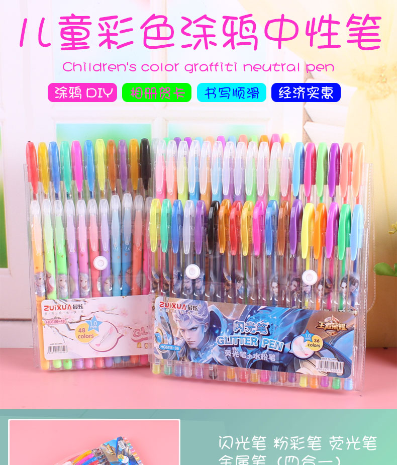 Children's cartoon princess color glitter pen fluorescent powder bright color pen metal pen 24 36 color set gel pen