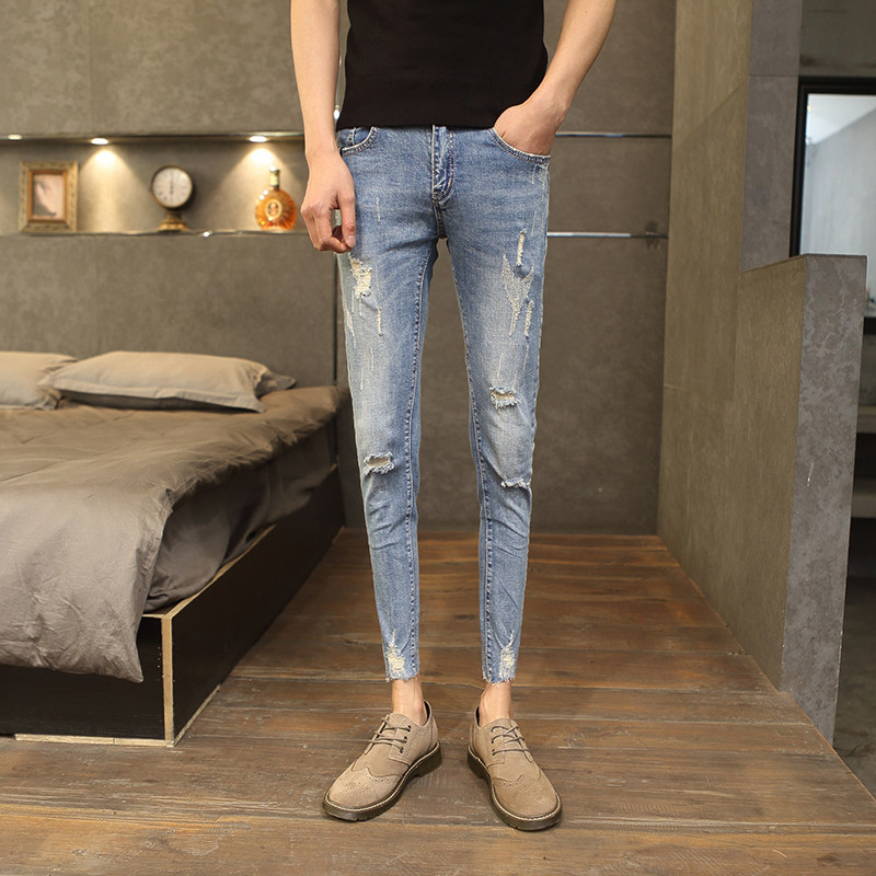 Nine-point jeans men's slim feet spring and summer 2021 Korean version of the trend ins hole student hole 9 points pants