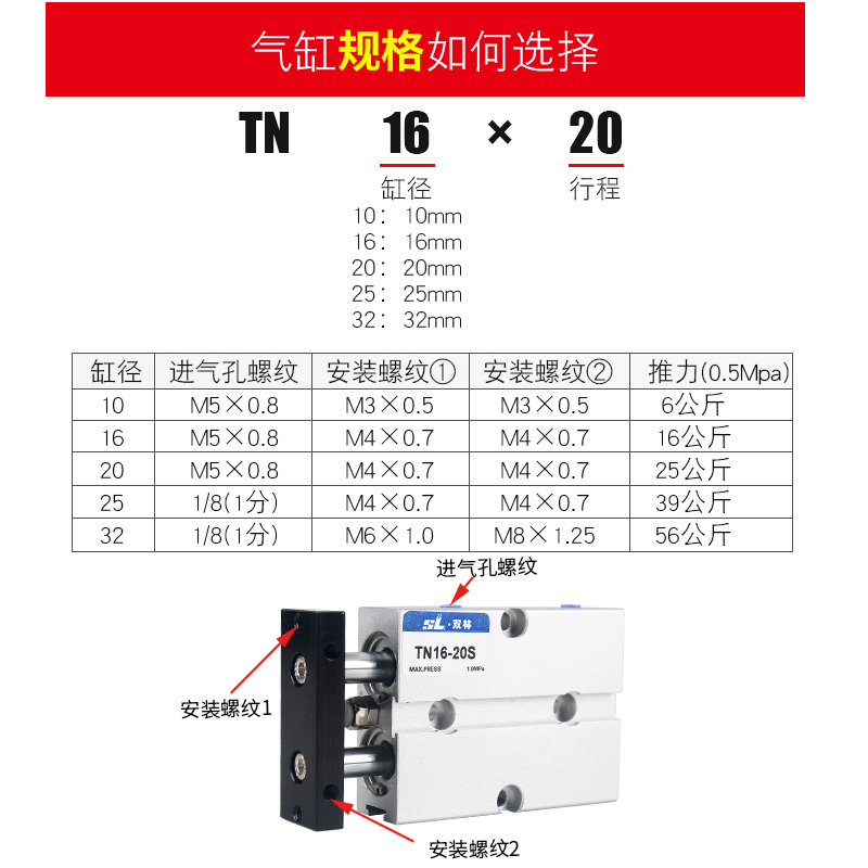 Pneumatic small twin-rod twin-shaft cylinder TN10 16 20-10*20 30 40 50 60 70 75 100-S