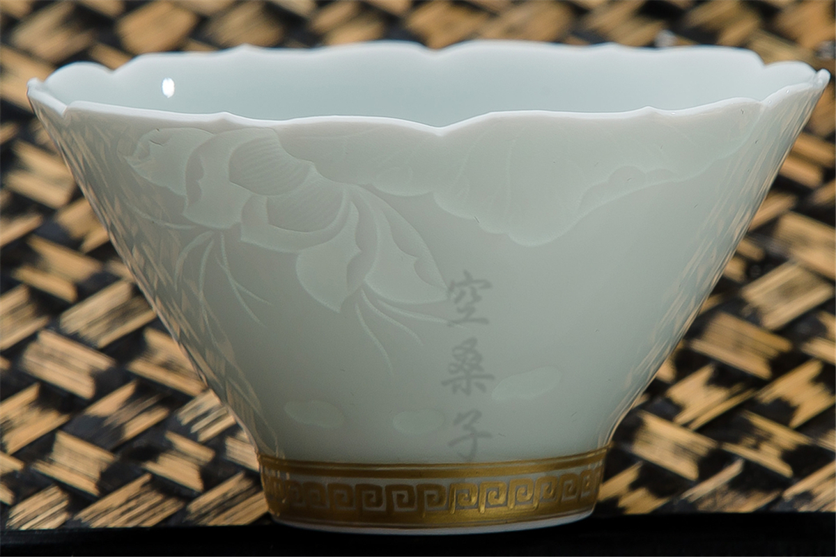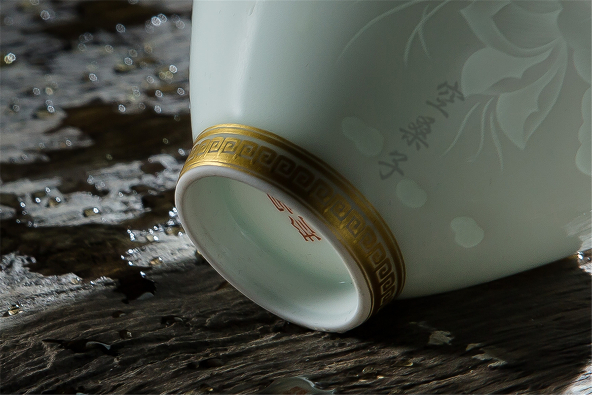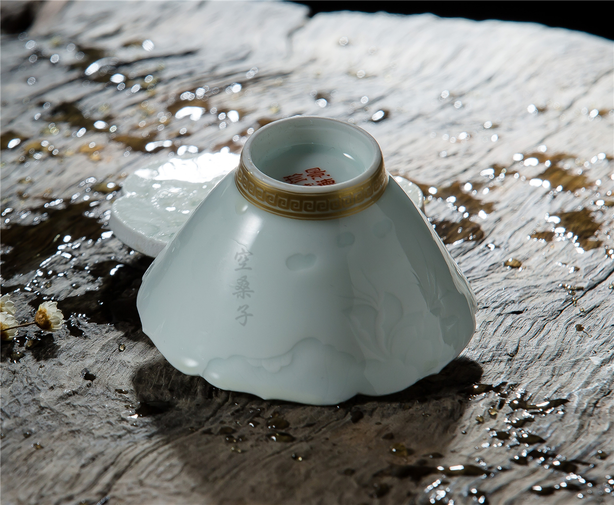 Jingdezhen handmade ceramic carving shadow celadon half knife mud Lotus Pure gold edge back pattern hat Tea cup