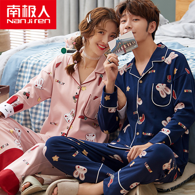 Antarctic spring and autumn lovers Korean version pajamas women's long-sleeved cotton cardigan jacket cute suit men's large size home clothes
