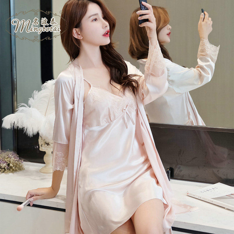 Pajamas women's summer short-sleeved two-piece suit silk lace skirt sexy spring and autumn long-sleeved ice silk nightdress home service