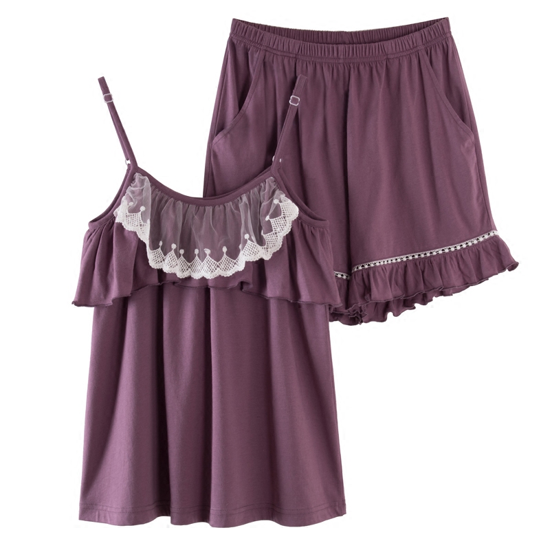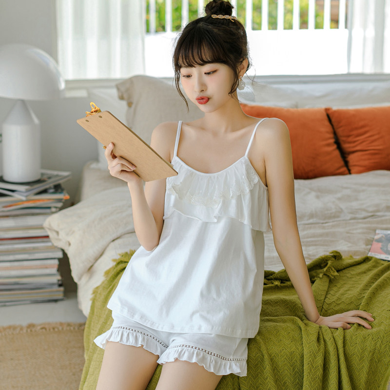 Summer pyjamas woman pure cotton cute Korean version sweet and beautiful princess wind lotus leaf border bump strap sleepwear shorts suit-Taobao