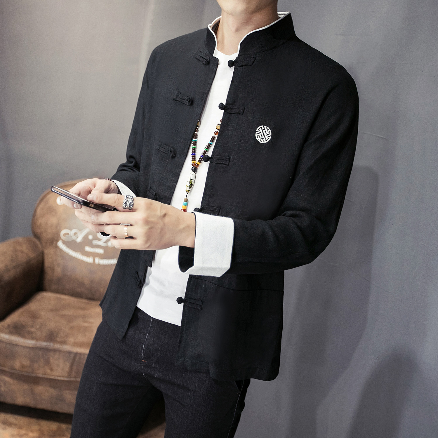 Chinese style men's coat Tang suit men's retro buckle jacket slim top linen clothes men's long sleeve shirt men