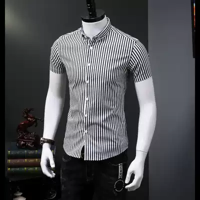 Tide brand shirt men's short sleeve Korean summer new boy jujube striped shirt casual slim men's inch clothing