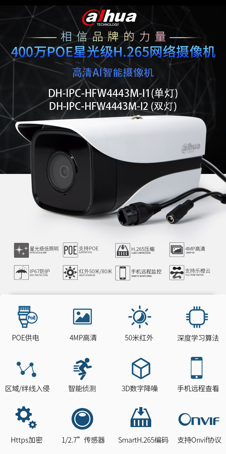 Dahua 4 million Star Class H 265 Double Light POE Intelligent Internet Camera DH-IPC-HFW4443M-I2
