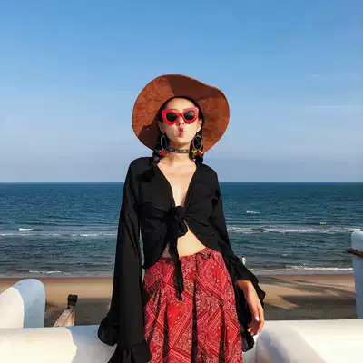 Cat Hotel Qinghai bohemian exotic style holiday style ruffle sleeve V-neck chiffon shirt cardigan top