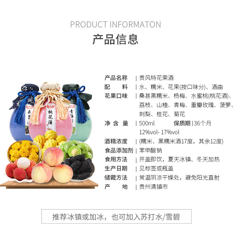 12°Bayberry wine 500ml 12°Osmanthus wine 500ml 12°Mulberry wine 500ml 17°Glutinous rice wine 500ml 17°Black glutinous rice wine 500ml
