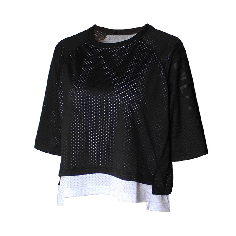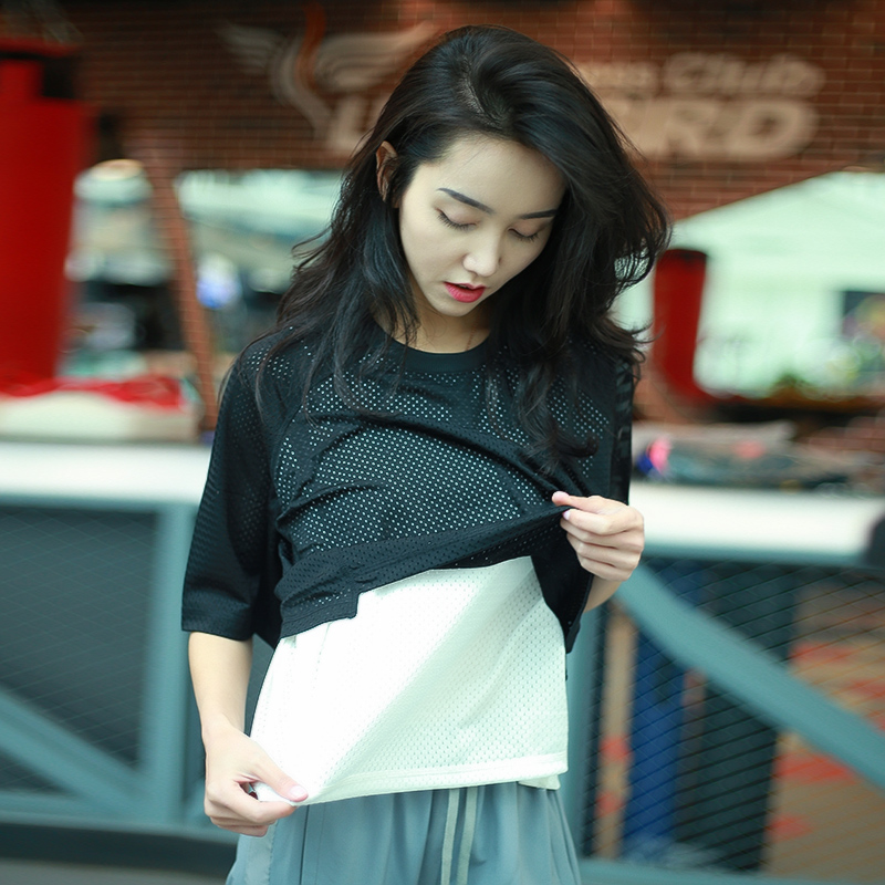 Cool and summer loose fitness suit T-shirt female speed dry blouse running half sleeve sports hood shirt yoga short sleeve double layer net