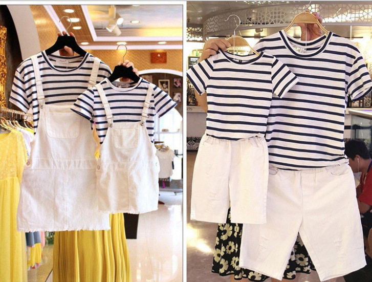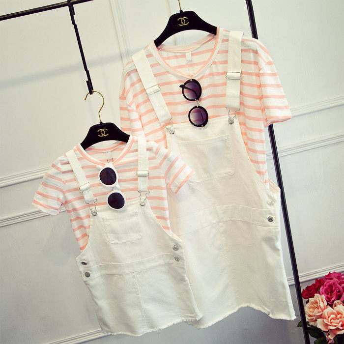 2018 summer new family suit for three - mouth casual striped T - shirt cowboy hugging bag skirt