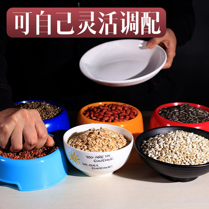 100 grams of peanuts, 100 grams of rice grains, 100 grams of black pearl raw melon seeds, 100 grams of red beans, 100 grams of wheat kernels, 100 grams of raisins, 1 oatmeal