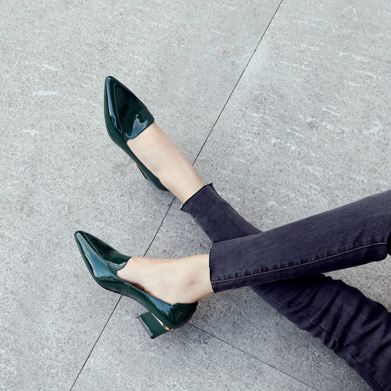 Red single shoes 2023 spring with British wind leather shoes leather black heels lady thick heels and ladies