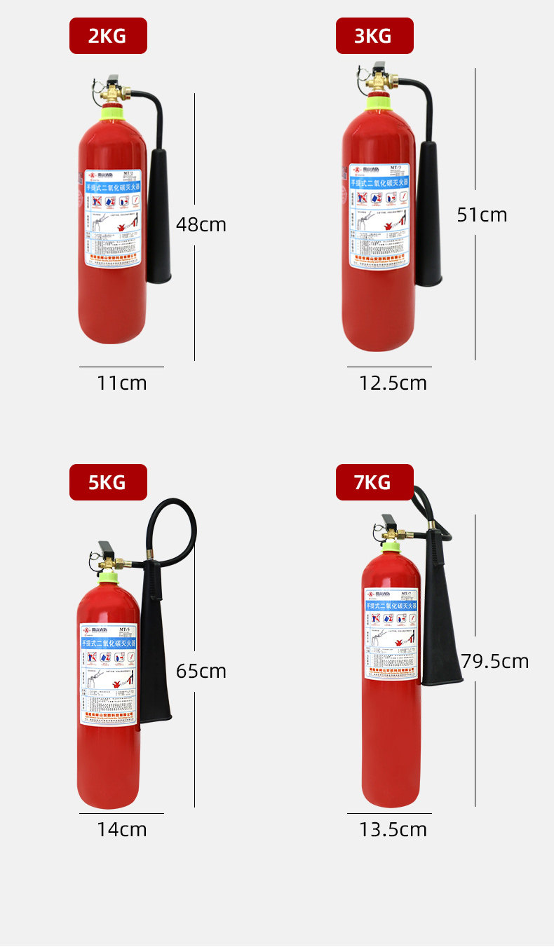 Carbon dioxide fire extinguisher 2KG carbon dioxide fire extinguisher 3KG carbon dioxide fire extinguisher 5KG 7KG carbon dioxide fire extinguisher 7KG carbon dioxide fire extinguisher cart style 24KG placement 2KG 2