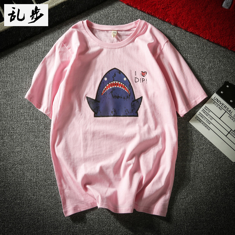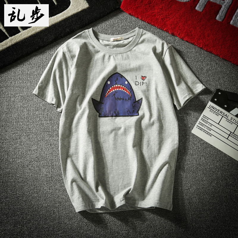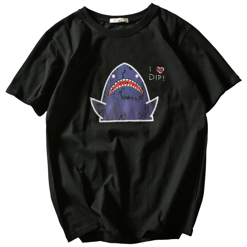 Ins super hot T-shirt short sleeves Japanese vintage cartoon shark print mens t-shirt Hong Kong style student class uniform