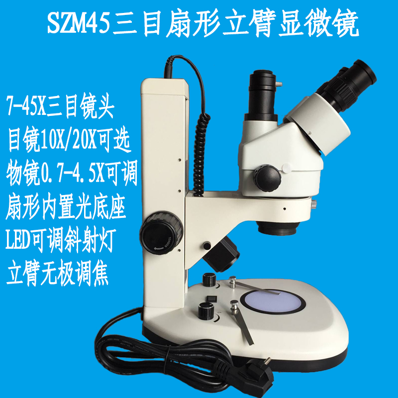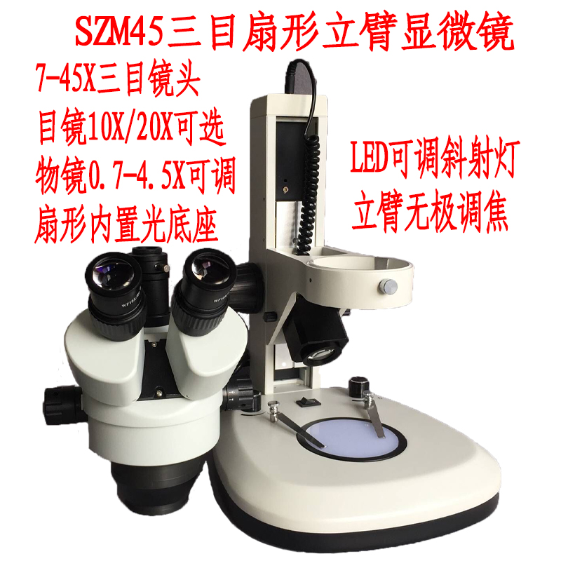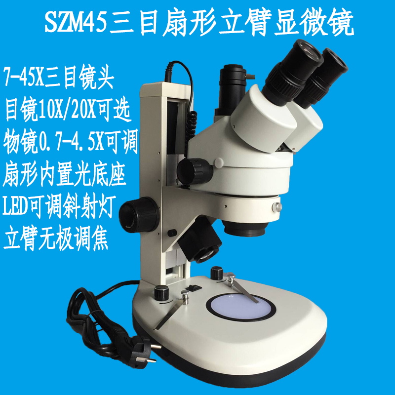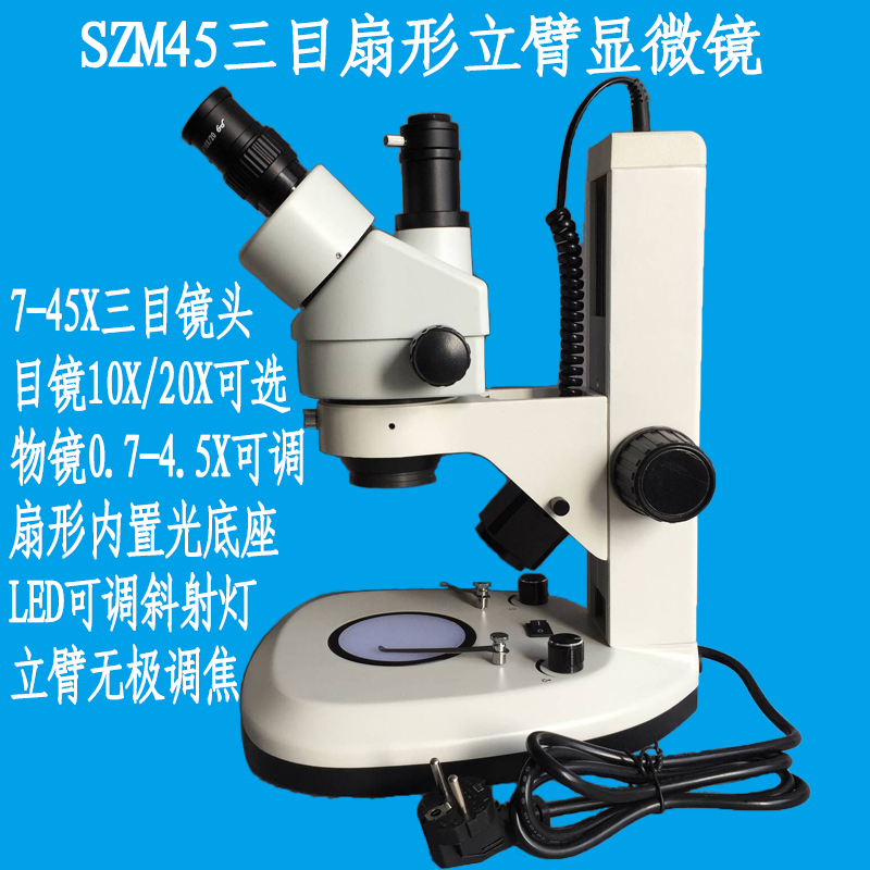 SZM45 Three-mesh microscope 7-45X body continuous variefold sector base built-in light source upright arm focusing