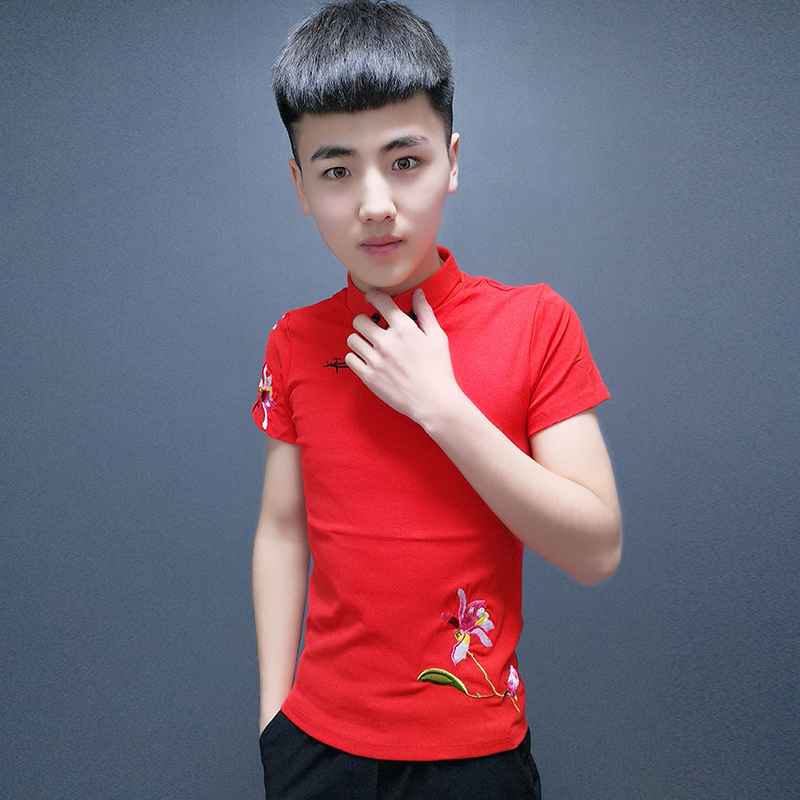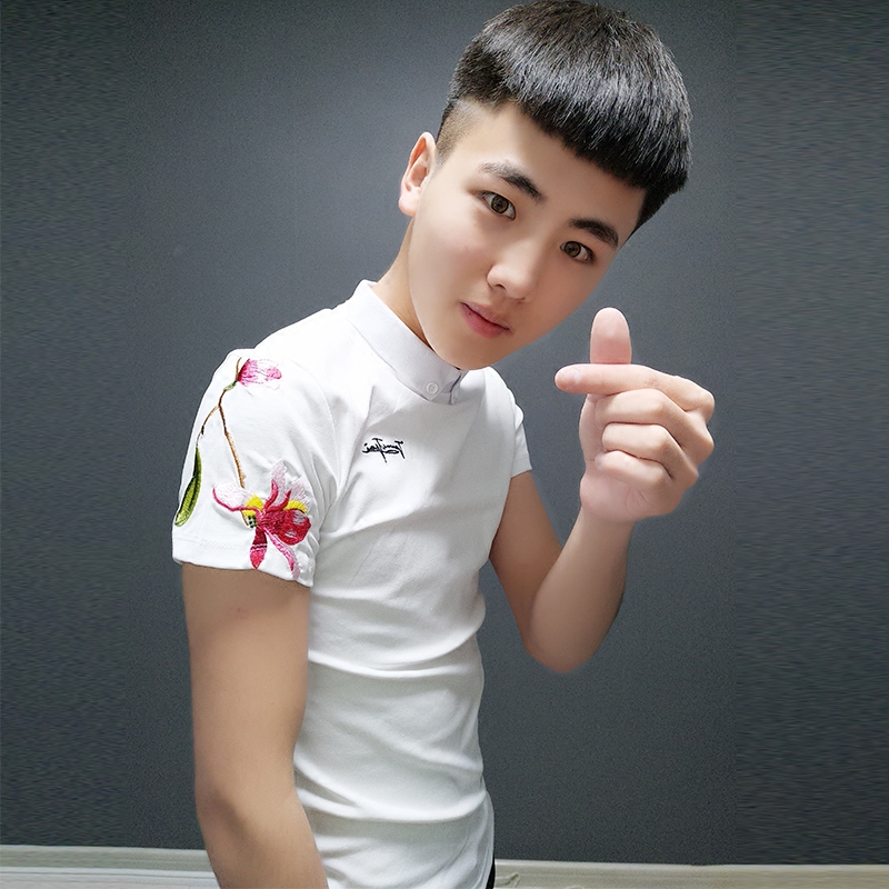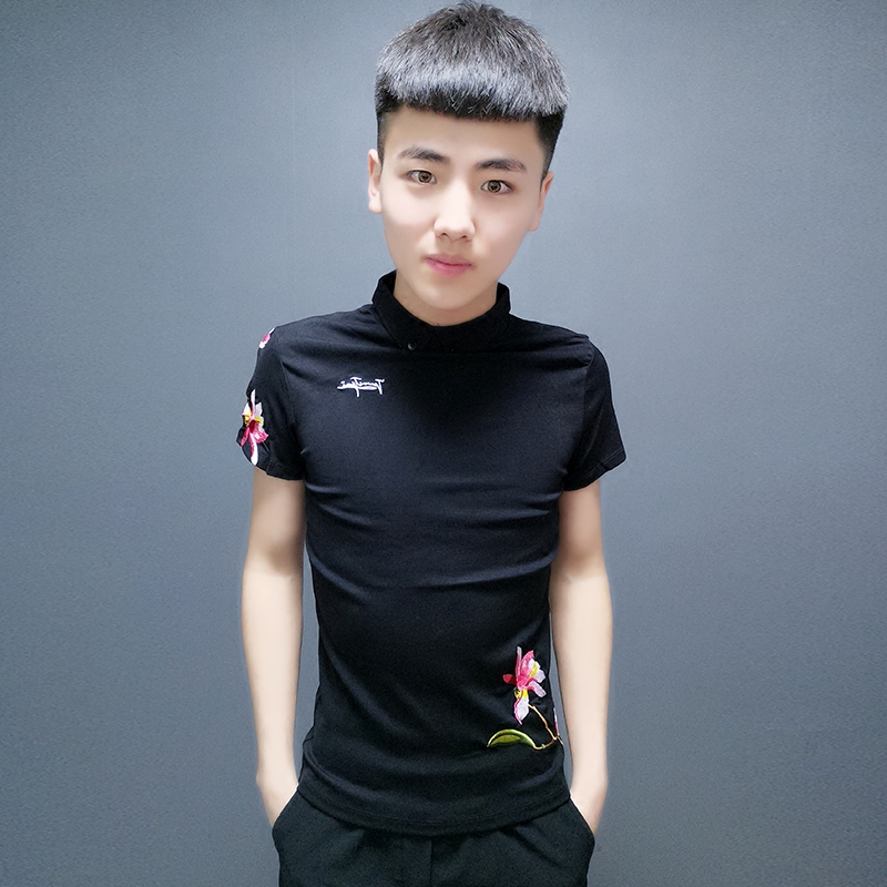Polo shirt summer new men's fashion plant flower embroidery lapel black top trendy social guy Kuaishou same style