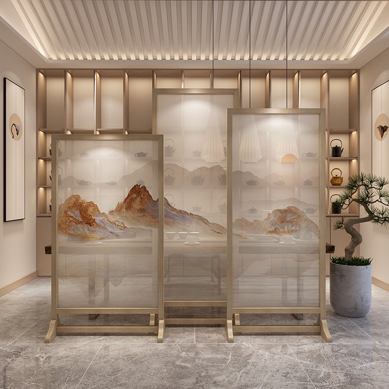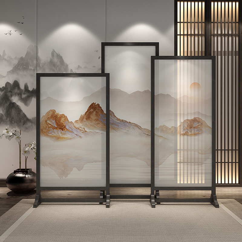 New Chinese Screen Xuanguan Partition Wall Living Room Simple Modern Tea Room Solid Wood Mobile Cloth Art Golden Landscape screen