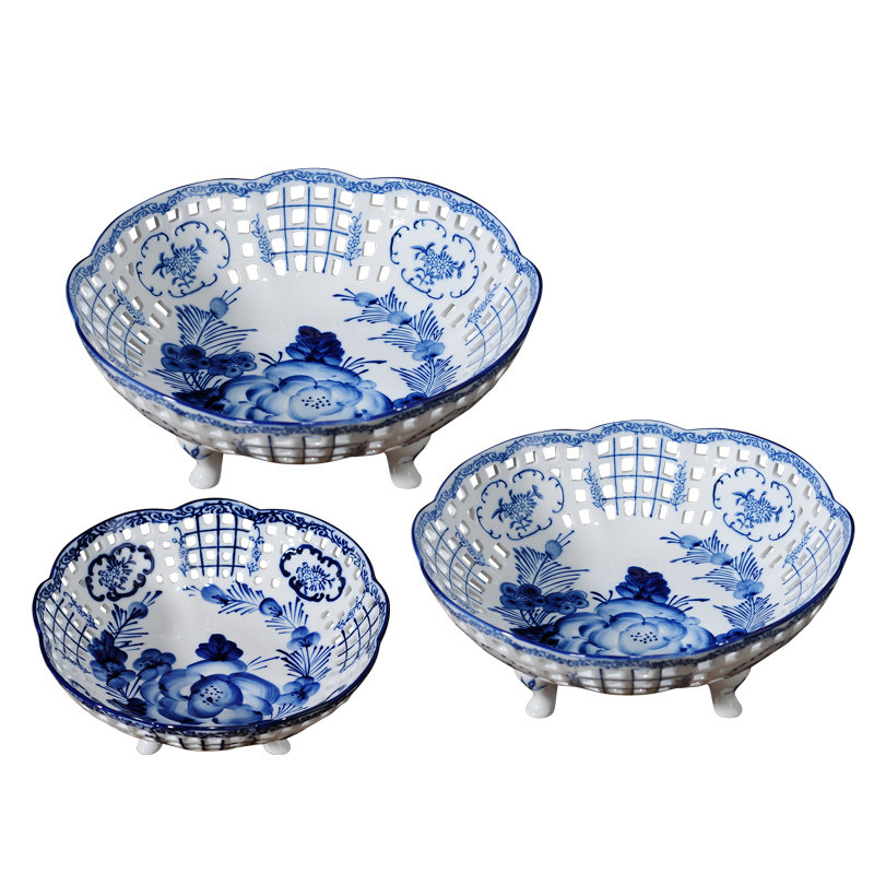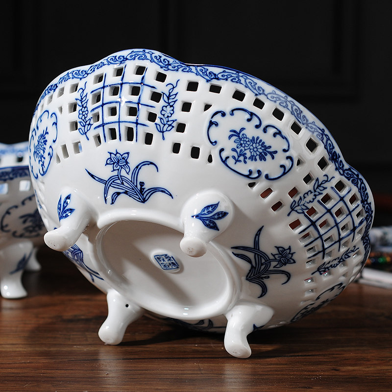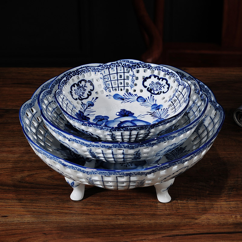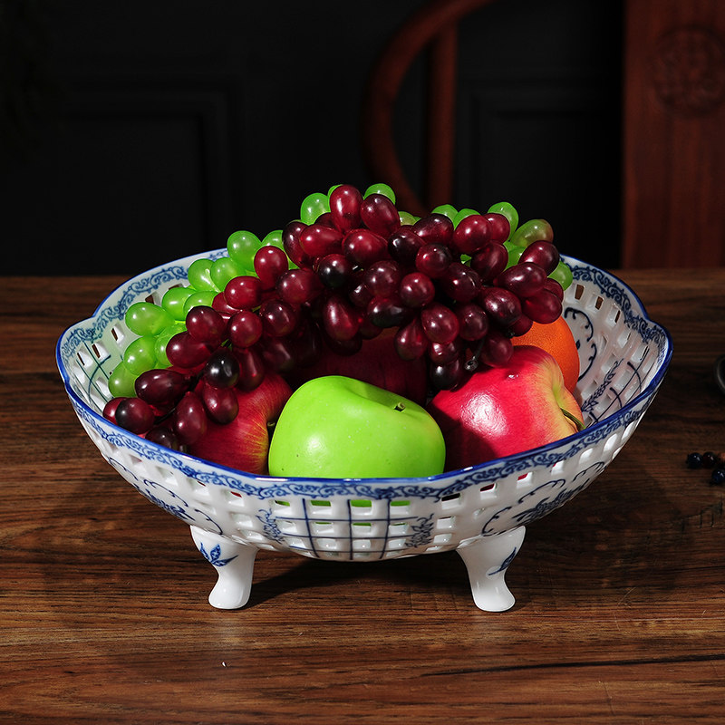 Blue Hua Ceramic Fruit Disk Modern New Chinese Style Hollow Handdrawn Handpicked Chinese Wind Creative Household Living Office