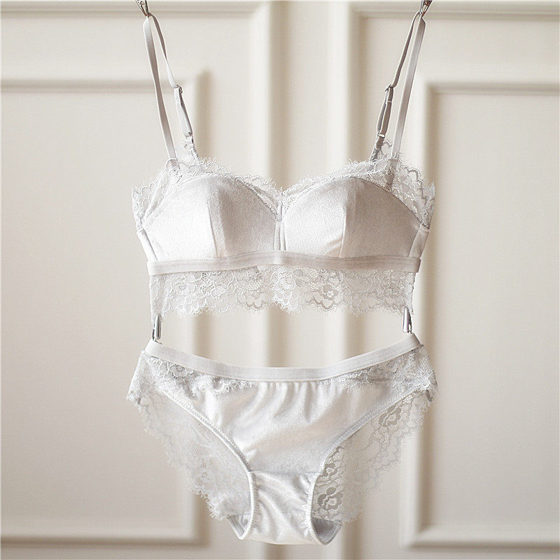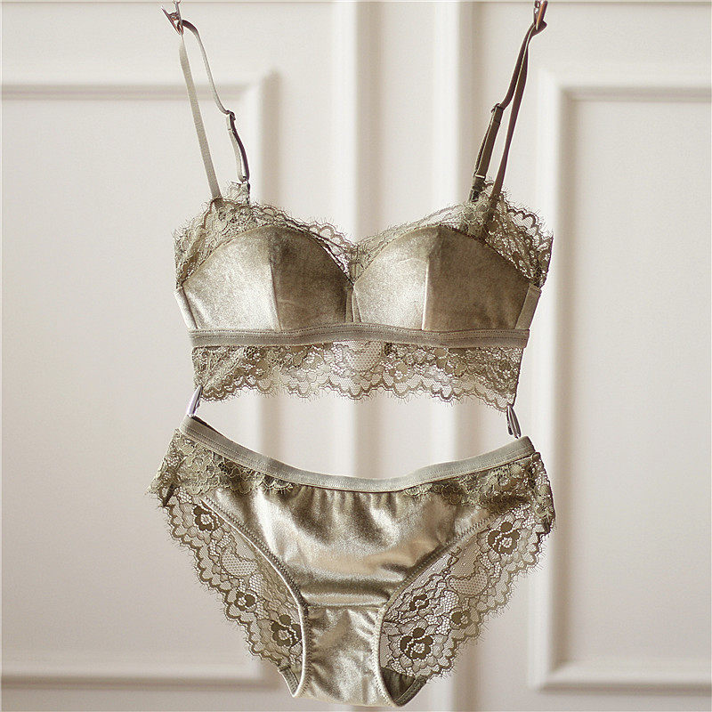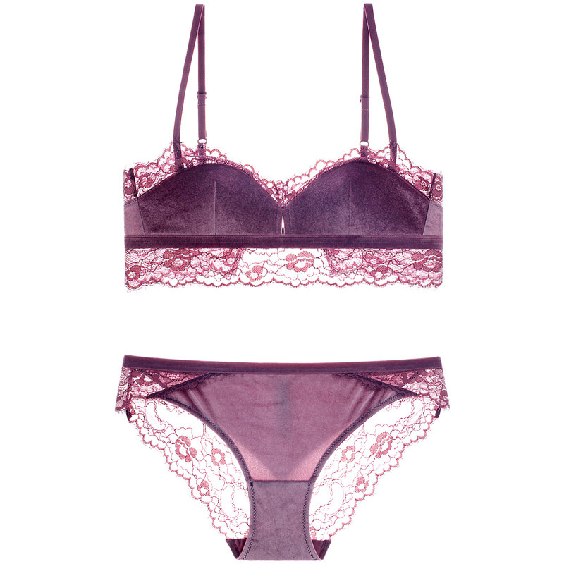 European and American bra slim-free steel ring half-cup lace mesh yarn pure color minimalist lingerie suit velvet sexy autumn and winter new